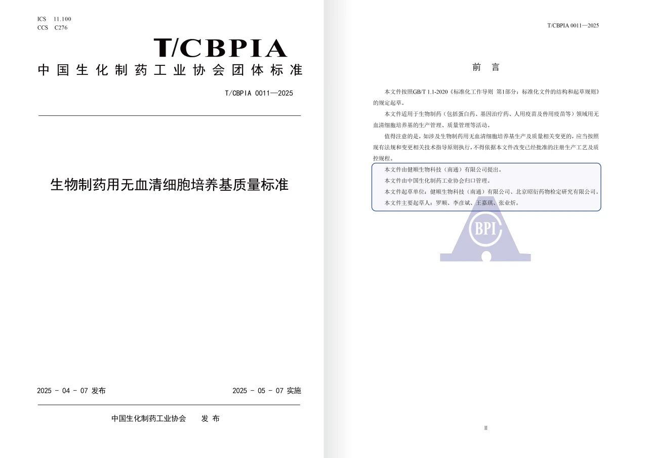 为推动生物制药产业高质量发展,应对行业高速发展下核心原材料质量管控的迫切需求,中国生物制药行业协会(中生药协)牵头组织制定《生物制药用无血清细胞培养基质量标准》(T/CBPIA 0011—2025)。健顺生物科技(南通)有限公司作为主撰稿单位,凭借自身专业技术与实践经验,为标准内容提供有力支撑。该标准经严谨评审后,于2025年4月7日正式发布,5月7日起实施,此前已在全国团体标准信息平台完成公示,标志着我国生物制药关键原材料标准化建设迈入新阶段。