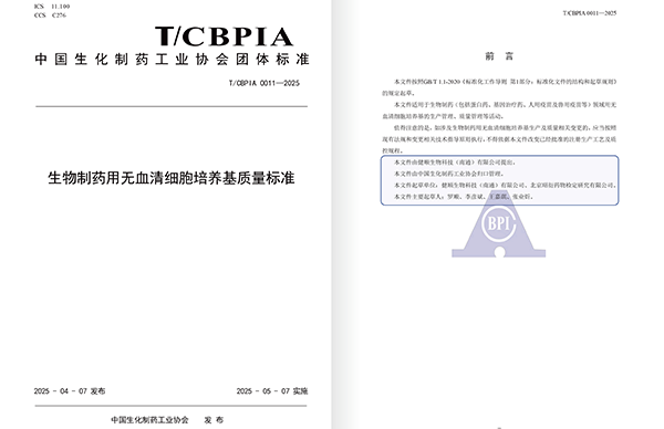 4月,由中国生化制药工业协会组织,健顺生物科技(南通)有限公司主撰的团体标准《生物制药用无血清细胞培养基质量标准》发布